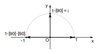 In the x-y plane, number 1 represents a point in the x-axis, and has an implied direction from the origin to the point, the same direction as that of the positive x-axis. Therefore, number 1 can be treated as a unit vector for the x-axis, and rotated by rotational numbers. Multiplying [90] to number 1 rotates the unit vector counterclockwise by 90 degrees with 1[90] pointing to the positive y-axis direction. Further multiplying [90] rotates the implied direction of 1[90] to the negative x-axis direction or the direction represented by –1. The process is expressed as 1[90][90] = −1. Let the orthogonal rotational number be designated by the symbol :